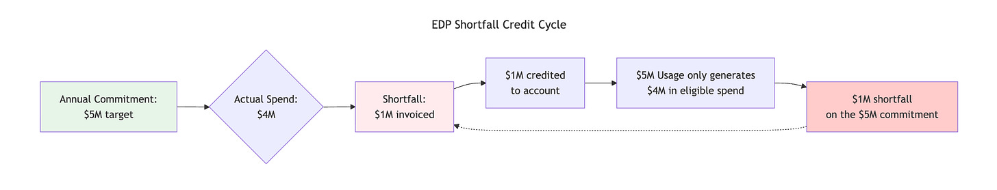 EDPs require substantial annual spending commitments, typically structured as minimum annual targets over multi-year periods. These commitments are designed to be achievable only for organizations in consistent growth mode, which aligns with the cloud provider's revenue goals but can create challenges when business priorities shift.