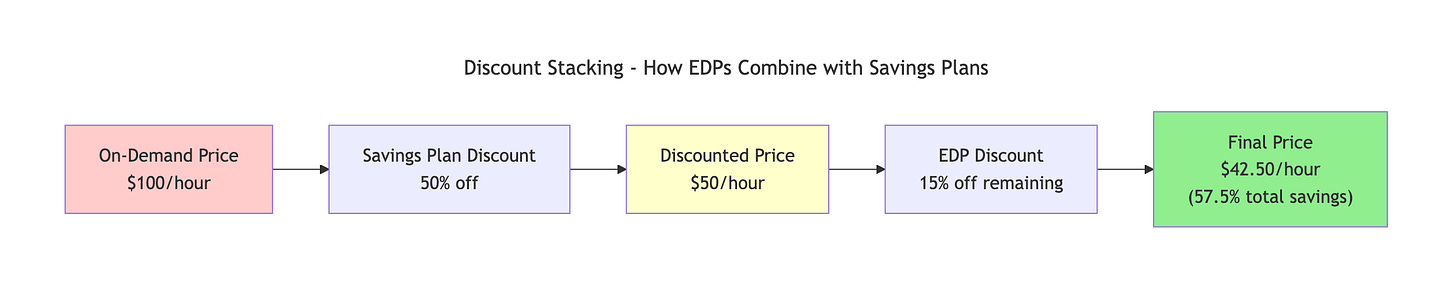 These discounts are substantial - often 10-15% across everything—and stack with existing savings plans and reservations. For compute resources already discounted 50% through savings plans, an additional EDP discount can bring total savings to 60% or more off list prices.