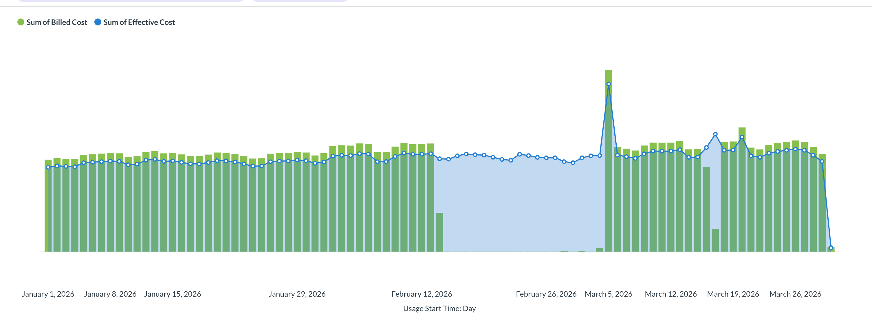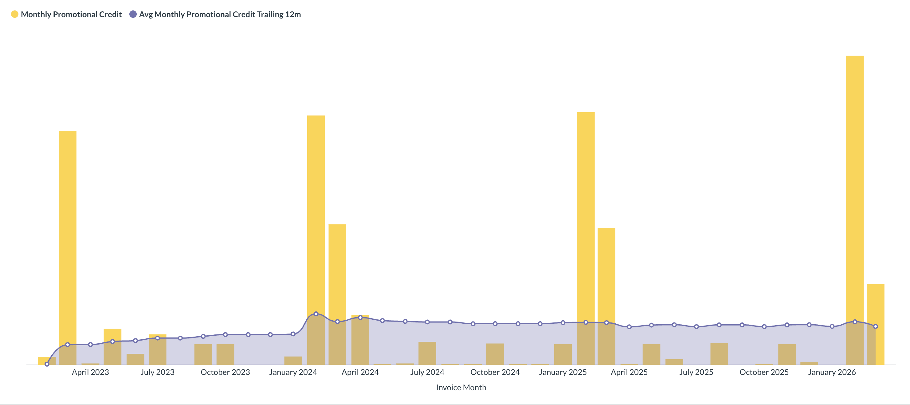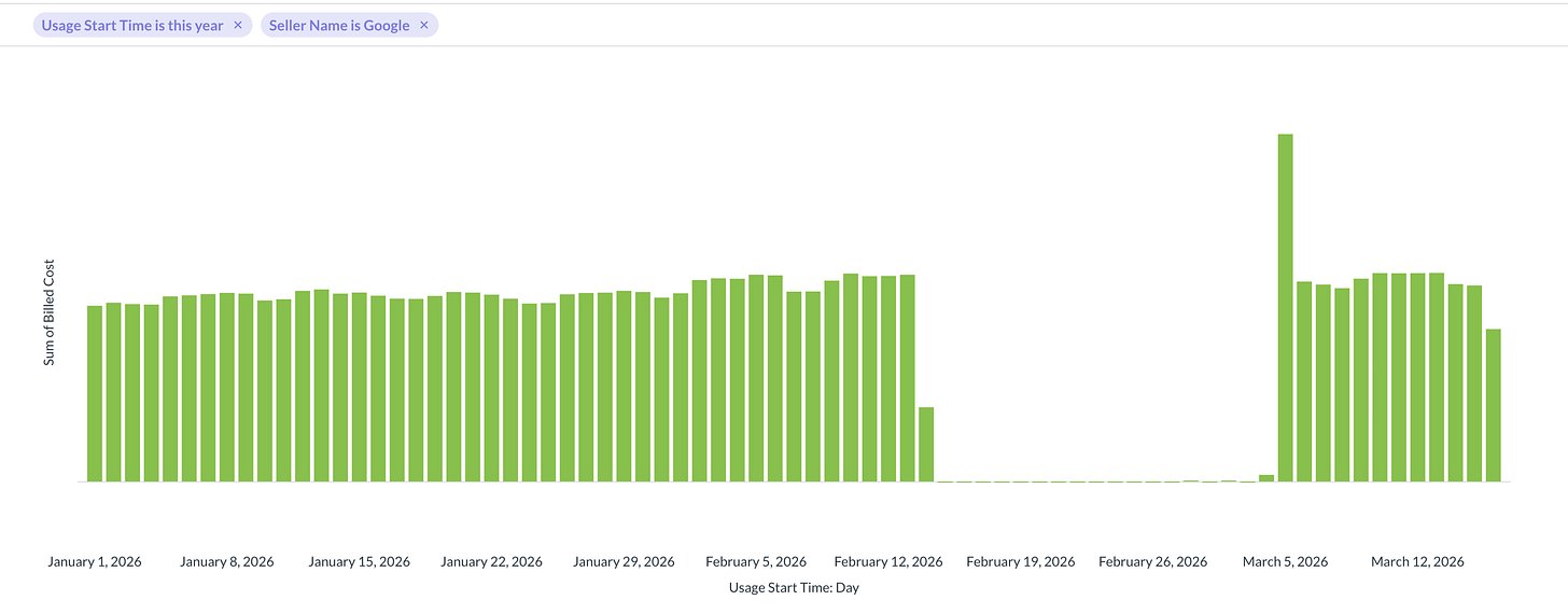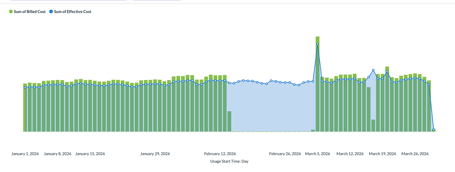 So, I’m solving “the January problem” today at my current employer, except that here it’s a February-March problem. To refresh our memory, this happens when you have a long term commitment with a cloud vendor that contains a provision for some kind of promotional credits to be applied to your bill. I’m not a fan of these credits but I understand why they exist and also that nobody cares what FinOps thinks about the arrangement. I’ve experienced this with two vendors so far - AWS and GCP - and they tend to make it rain on your bill to varying extents that can appear to zero out the cost of your bill on a cash basis. It looks basically like this: