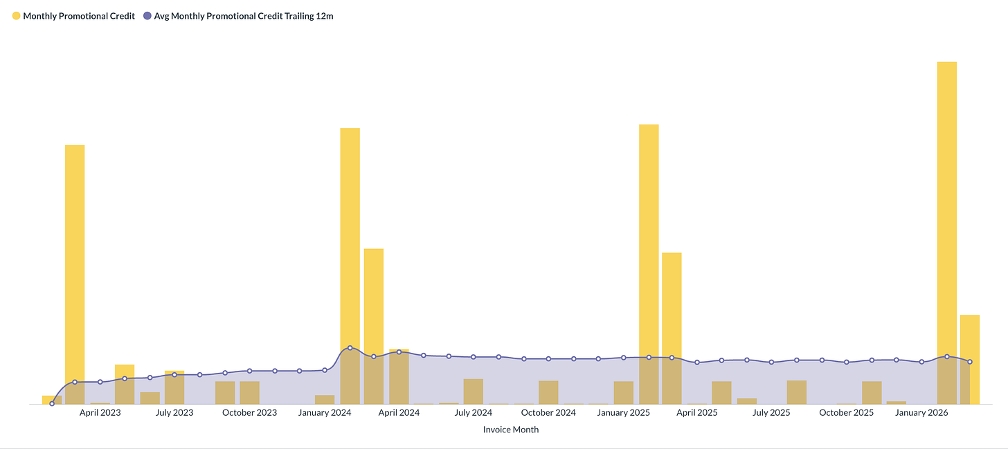 Let’s say you have $600k in annual credits, and an average annual spend of $12M. That would zero out roughly 2 weeks of cloud costs, and otherwise inflate the remaining costs by approximately 5% over what they should actually be.